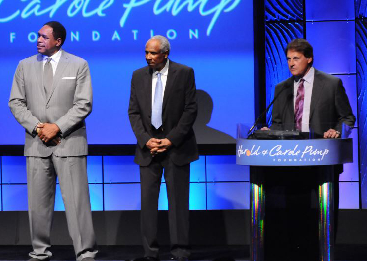 Roger Clemens with MLB All-Stars (L-R) Tony La Russa, Dave Winfield, Frank Robinson