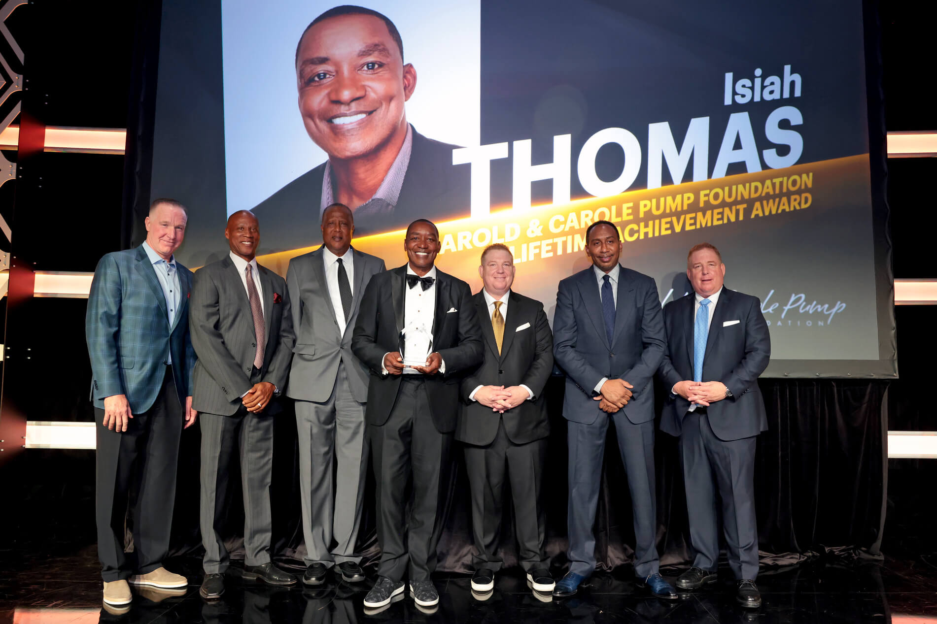 Chris Mullin, Byron Scott, Jamaal Wilkes, Honoree Isiah Thomas, Dana Pump, Stephen A. Smith, and David Pump